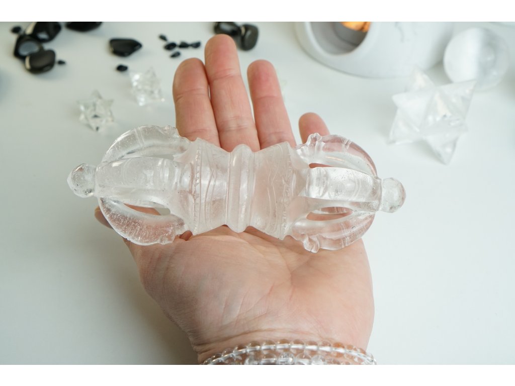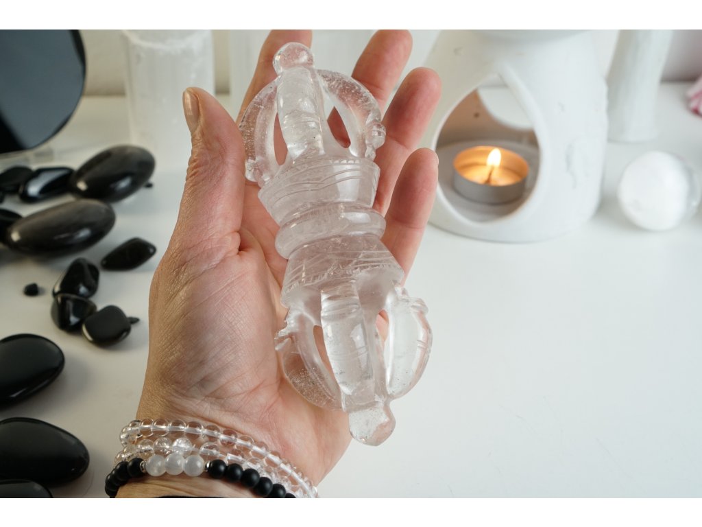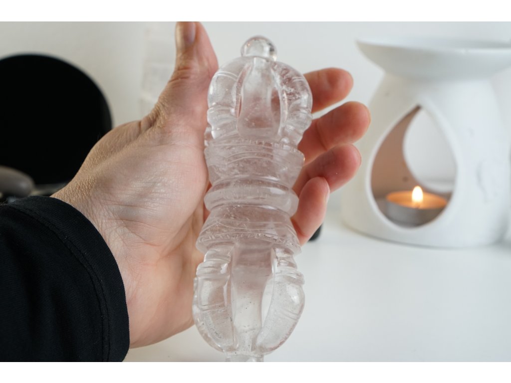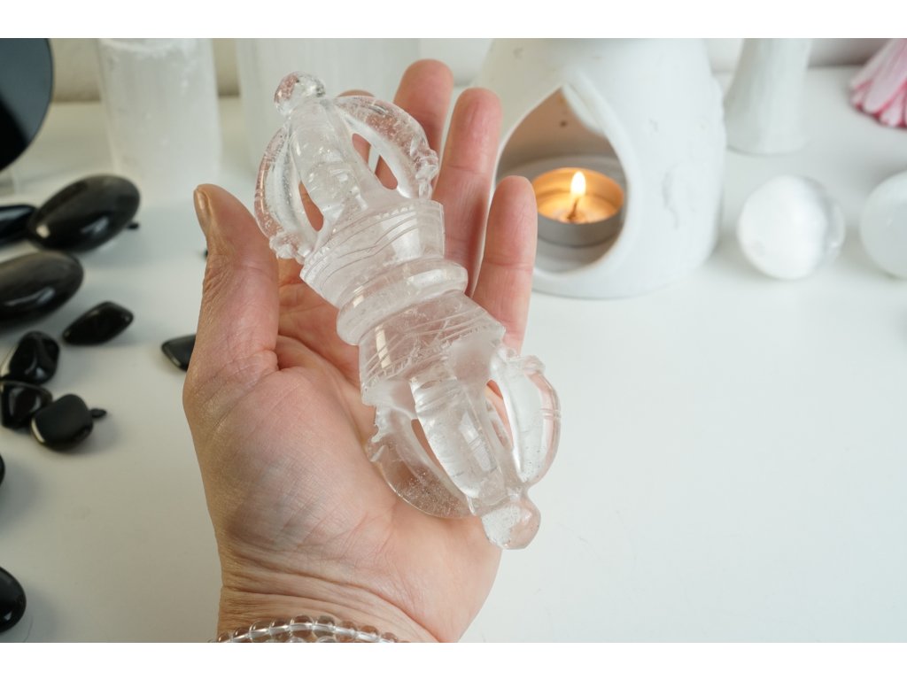 Křišťálová dordže (vadžra) je mocný duchovní nástroj, který se využívá při meditacích, duchovních praktikách a energetické práci. Pochází z tradičního učení Indie a Tibetu, kde se používá již po staletí pro své léčivé a ochranné účinky. Je známá svou schopností vyzařovat pozitivní energii a harmonizovat prostředí. Tato krásná, ručně vyráběná křišťálová dordže je silným pomocníkem při práci s energií a v oblastech osobním růstu.