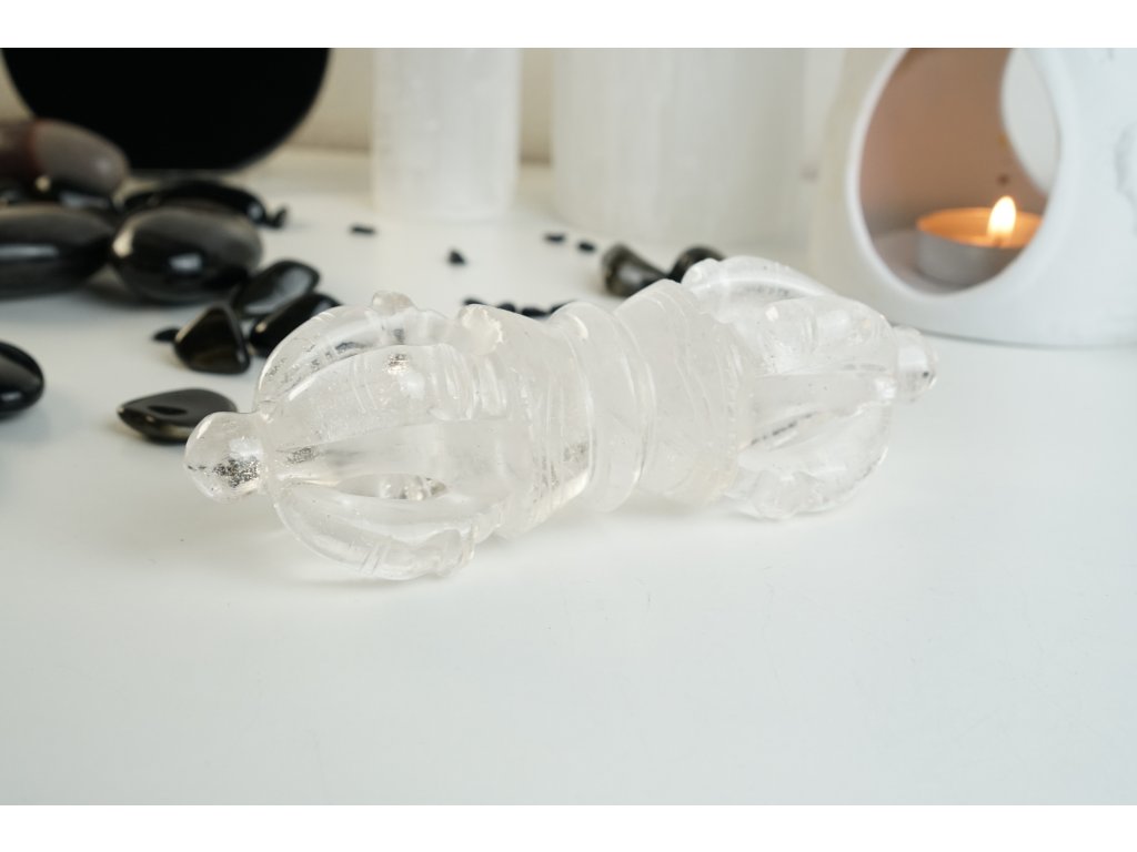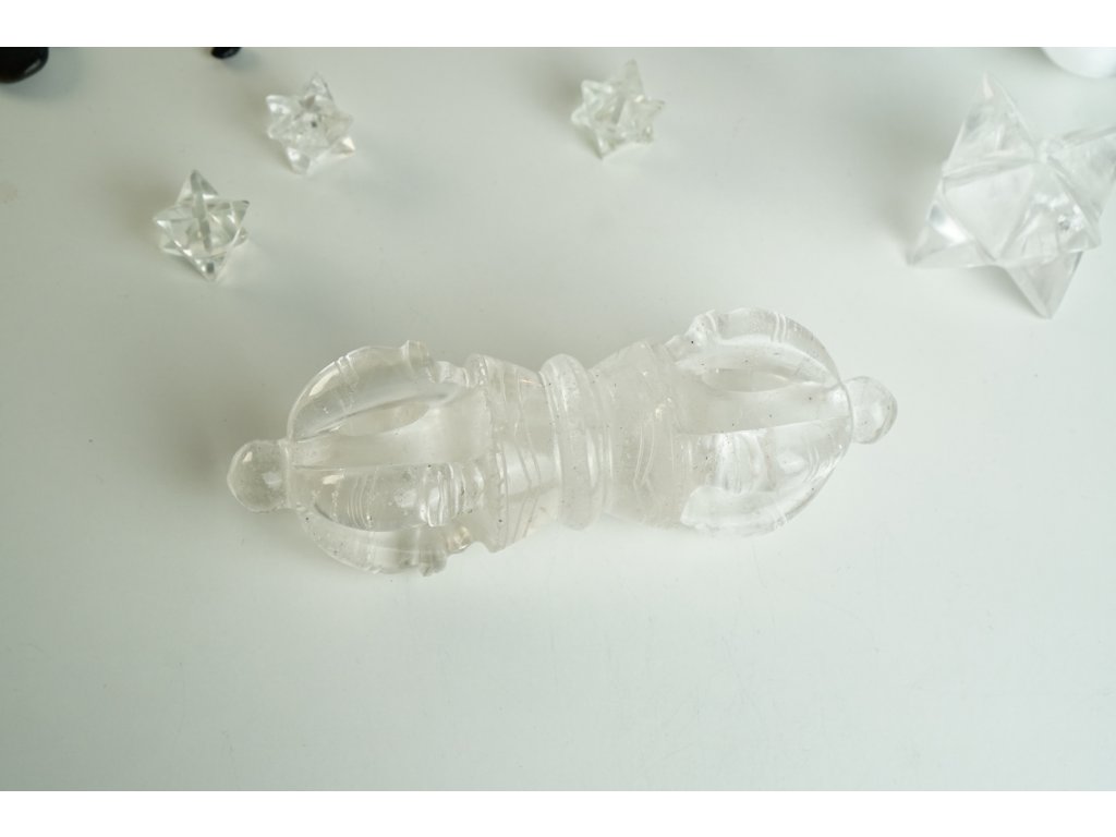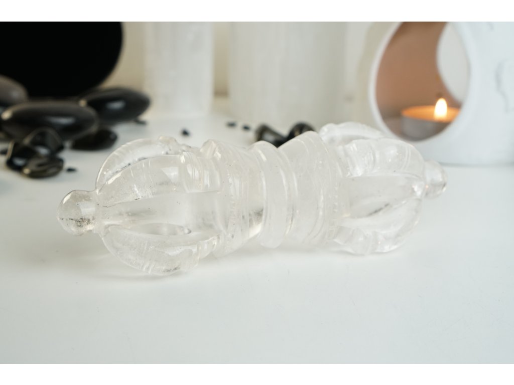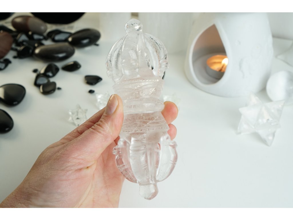Křišťálová dordže (vadžra) je mocný duchovní nástroj, který se využívá při meditacích, duchovních praktikách a energetické práci. Pochází z tradičního učení Indie a Tibetu, kde se používá již po staletí pro své léčivé a ochranné účinky. Je známá svou schopností vyzařovat pozitivní energii a harmonizovat prostředí. Tato krásná, ručně vyráběná křišťálová dordže je silným pomocníkem při práci s energií a v oblastech osobním růstu.