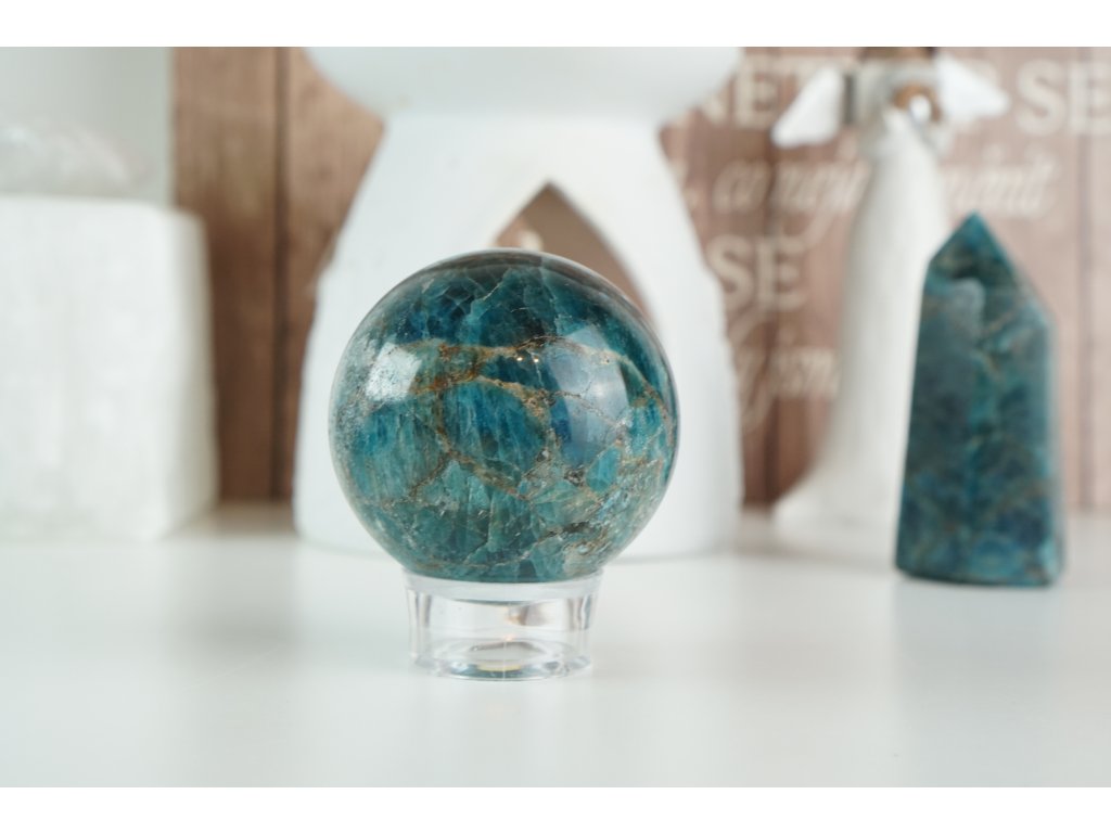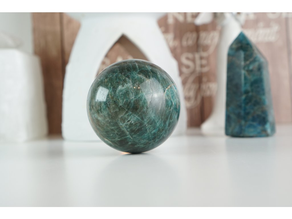 Tato koule z Apatitu vyzařuje inspirativní a očistné vibrace, podporuje duševní jasnost a kreativitu. Pokud potřebujete posílit intuici nebo chcete rozvíjet své vnitřní schopnosti, je ideální mít tuto kouli často ve své blízkosti. Při meditacích a duchovní práci držte kouli v ruce nebo přikládejte na části těla.