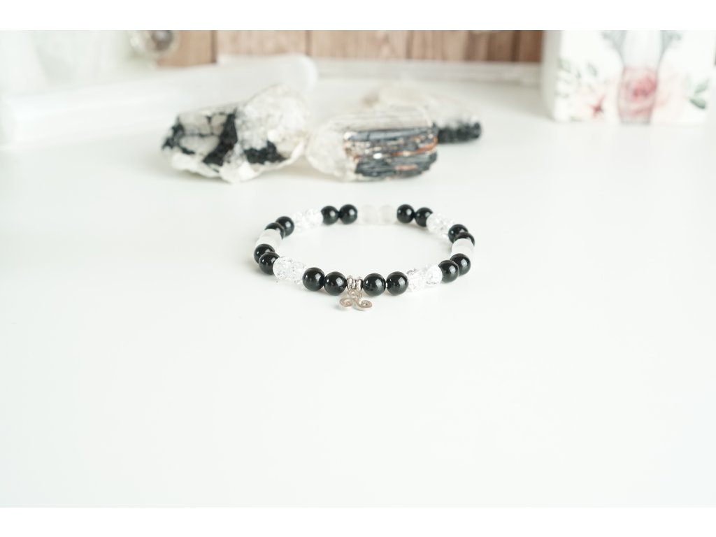 Tento náramek z Křišťálu s Turmalínem, je silný nástroj pro ochranu a harmonizaci energie. Turmalín v křišťálu pomáhá chránit nositele před ataky negativních energií z venčí. Křišťál ještě více zesiluje jeho pozitivní účinky. Časté nošení tohoto náramku podporuje emocionální rovnováhu, zmírňuje stres a posiluje celkovou vitalitu. Kromě toho zlepšuje koncentraci a podporuje jasné myšlení.